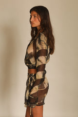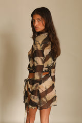 Light as air and designed to move with you, the Theros Wrap Top is made from semi-sheer silk crepe and hand tie-dyed in earthy tones. It features a wide lapel collar and an adjustable wrap design that ties at the waist for a custom fit. The fluid fabric and artful dyeing make each piece unique. Pairs perfectly with the coordinating mini skirt and python bag.